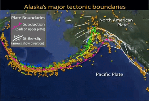 Alaskan tectonics are dominated by the Pacific-North American plates. The megathrust boundary between the plates results in both the 4,000-km-long Aleutian Trench and in the arc of active volcanoes that lie subparallel to the trench. This animation discusses the range of tectonic activity from megathrust earthquakes to accretion of geologic terranes.
